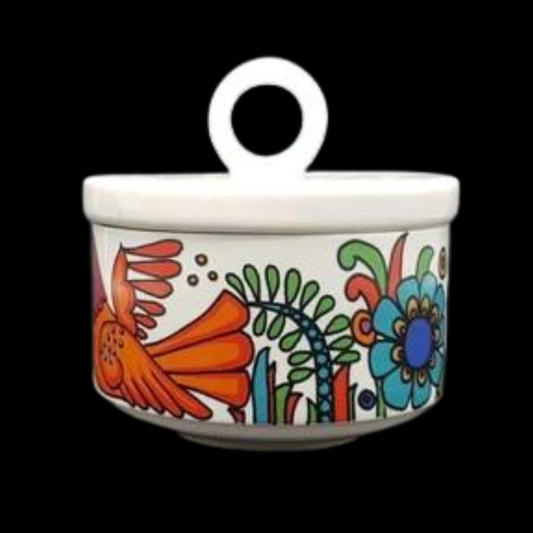 Das Acapulco-Geschirr von Villeroy & Boch, das von 1967 bis 1994 hergestellt wurde, gehört zu den bekanntesten Serien der Marke. Sein Design zeichnet sich durch tropische Blumen- und Vogelmotive in leuchtenden Farben wie Blau, Orange, Grün und Gelb aus. Inspiriert von mexikanischer Volkskunst, bringt das Dekor eine fröhliche, sommerliche Atmosphäre auf den Tisch. Ideal für Sammler und Liebhaber des Vintage-Stils.